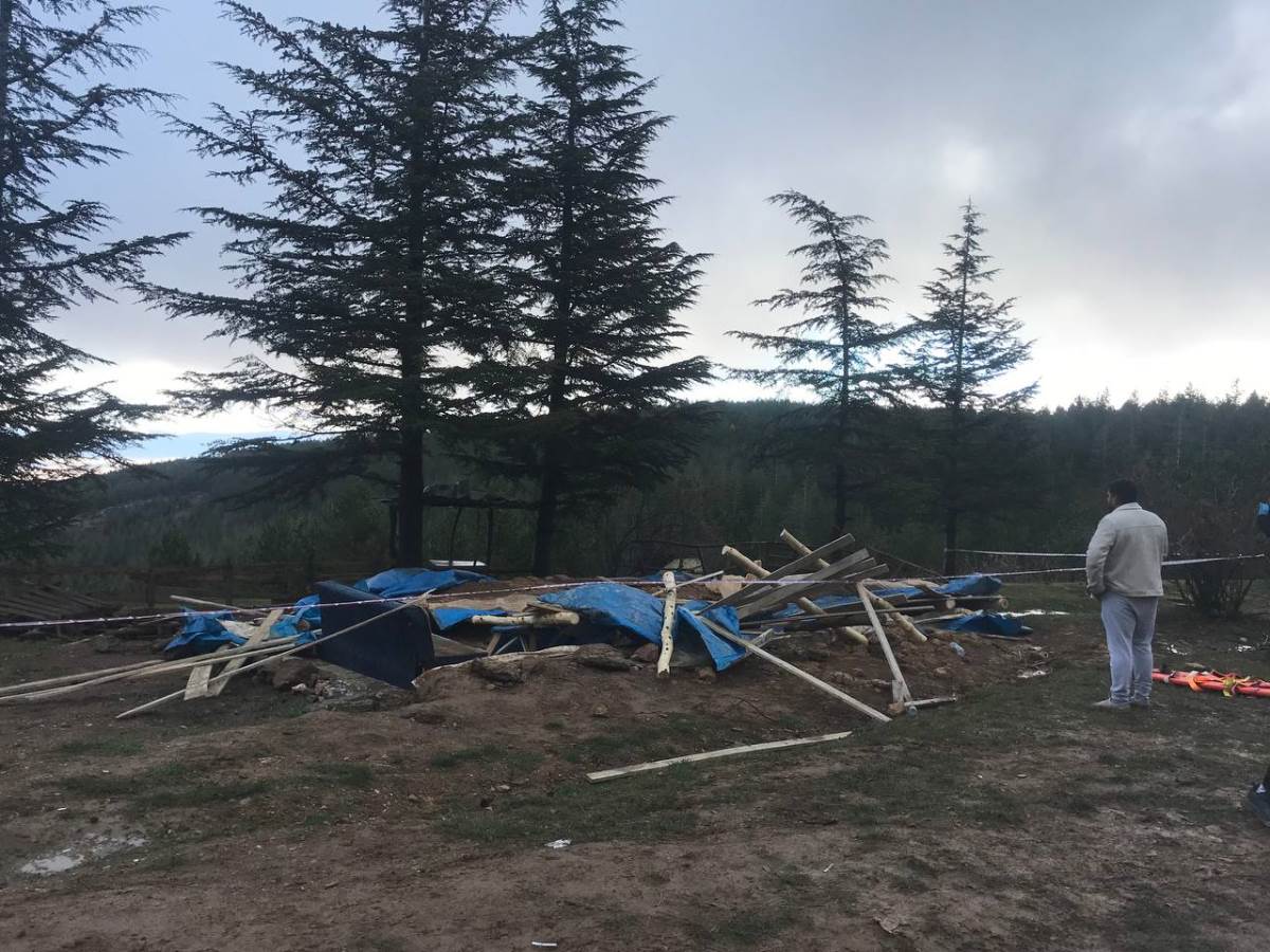 Konya'nın Akşehir ilçesi Çamlı Mahallesi'ndeki ormanlık alanda yürüyüşe çıkan bir grup yağmur ve fırtınadan korunmak için girdikleri barakanın yoğun yağış ve rüzgarın etkisiyle çökmesi sonucu altında kaldı.