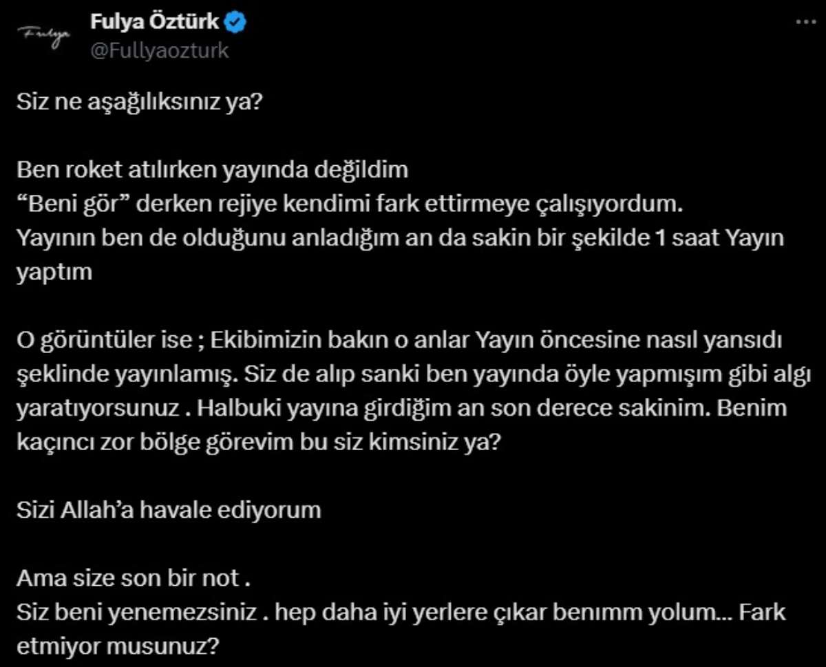 O görüntüler ise; Ekibimizin bakın o anlar Yayın öncesine nasıl yansıdı şeklinde yayınlamış. Siz de alıp sanki ben yayında öyle yapmışım gibi algı yaratıyorsunuz. Halbuki yayına girdiğim an son derece sakinim. Benim kaçıncı zor bölge görevim bu siz kimsiniz ya?