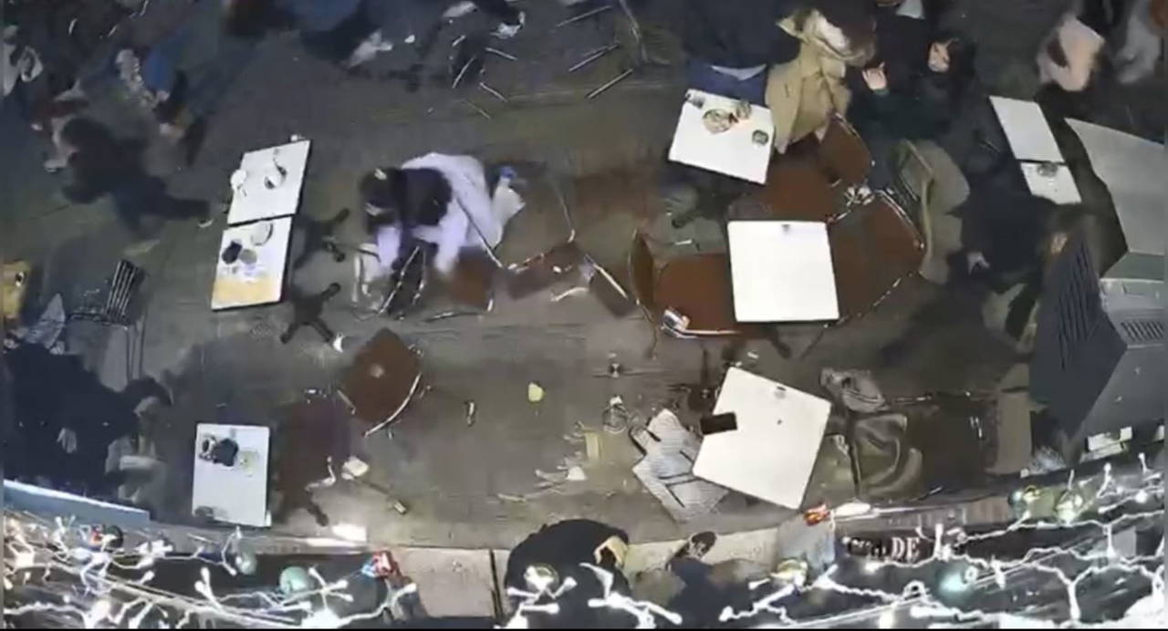 O esnada kafeteryanın dışında oturanlara, koşanlar çarpıyor. Masa ve sandalyelerin devrildiği olayda yurttaşlar can havliyle çığlık çığlığa kaçmaya devam ediyor.
