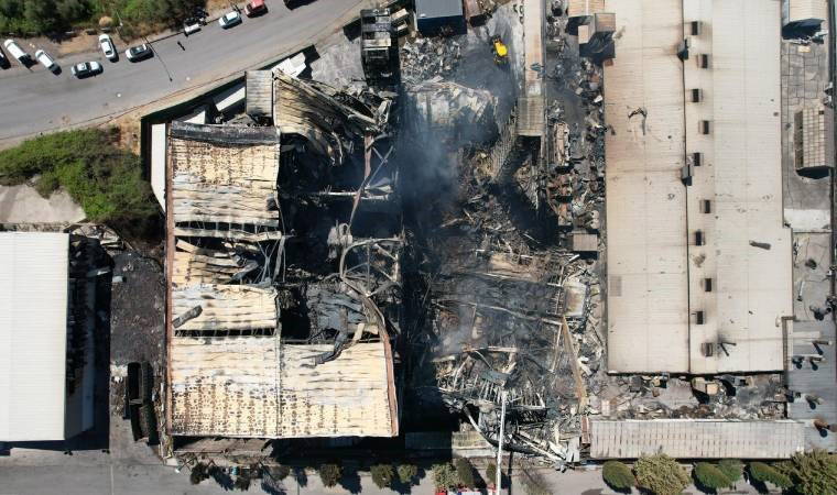 Görüntülerde, fabrikanın küle döndüğü, iş makinalarının ve itfaiye ekiplerinin çalışmalarının sürdüğü görülüyor.