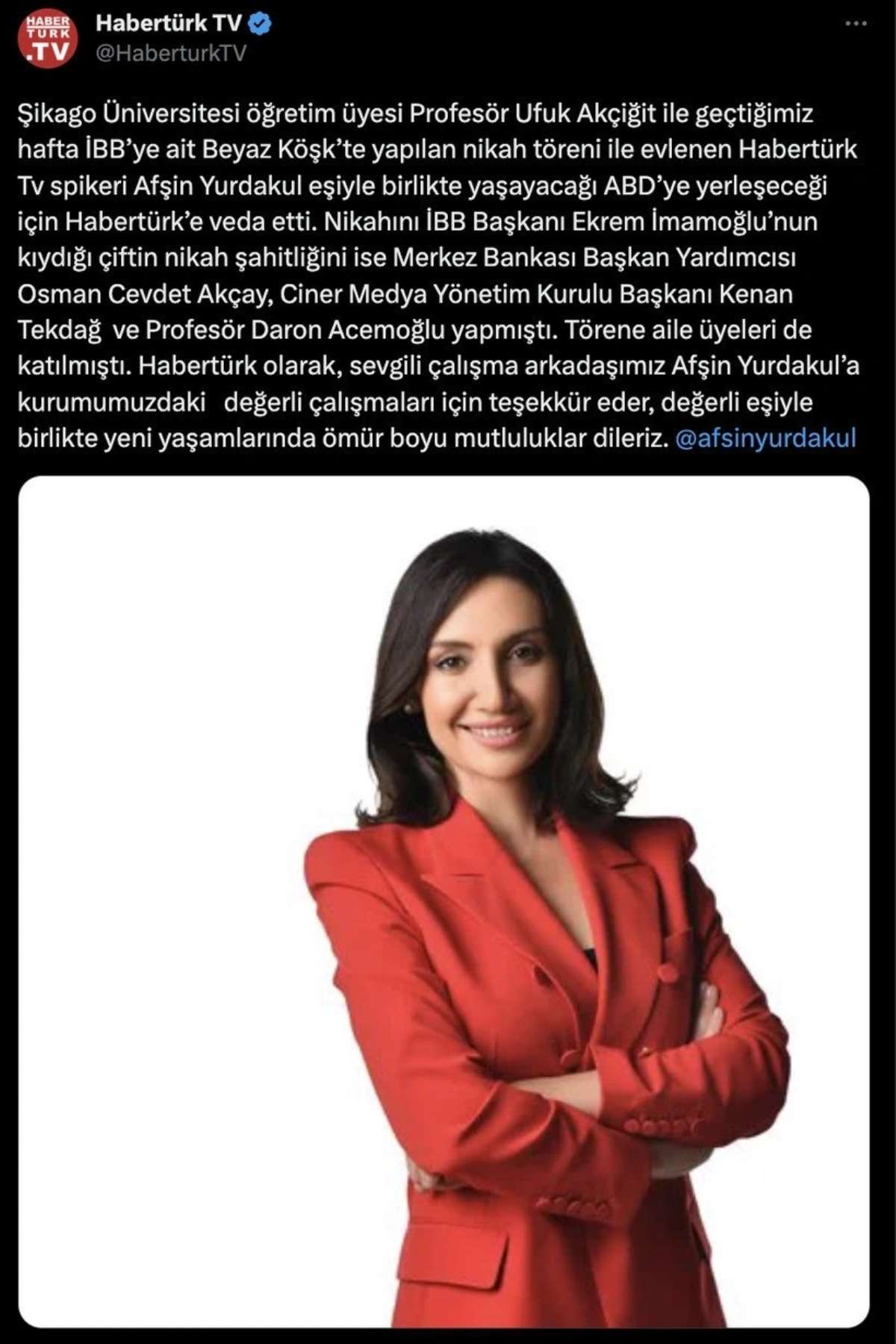 "Şikago Üniversitesi öğretim üyesi Profesör Ufuk Akçiğit ile geçtiğimiz hafta İBB’ye ait Beyaz Köşk’te yapılan nikah töreni ile evlenen Habertürk Tv spikeri Afşin Yurdakul eşiyle birlikte yaşayacağı ABD’ye yerleşeceği için Habertürk’e veda etti.