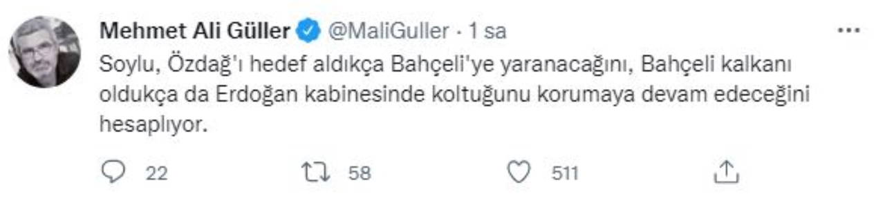 "Soylu, Özdağ'ı hedef aldıkça Bahçeli'ye yaranacağını, Bahçeli kalkanı oldukça da Erdoğan kabinesinde koltuğunu korumaya devam edeceğini hesaplıyor."