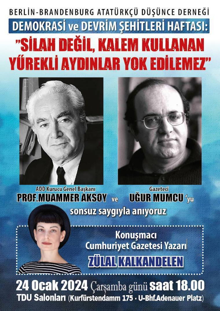 Gazetemizin yazarlarından Zülâl Kalkandelen, Demokrasi ve Devrim Şehitleri Haftası kapsamında 24 Ocak 2024 Çarşamba günü, Berlin Brandenburg Atatürkçü Düşünce Derneği’nin düzenlediği etkinlikte konuşacak.