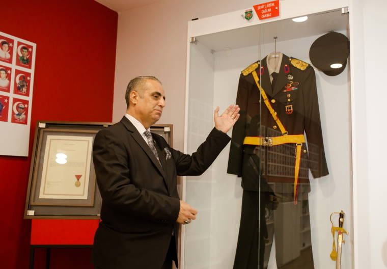 Şehit Jandarma Üstteğmen Çağlar Canbaz...Kendisi şehadet şerbetini içmiş vatanperver bir subaydı. Şehit olduğunda vücut bütünlüğü bozulmuştu. Nur içinde yatsın. Şehidimizin annesi “Evladımın tek hatırası Harbiye'den mezun olduğu tören kıyafeti” diyerek şehidimizin kılıcı ve ayakkabısıyla birlikte üniformasını derneğimize verdi. Biz de tüm şehitlerimizin adına kendisine özel bir köşe yaptık. Şairin dediği gibi “Bir hilal uğruna ya Rab ne güneşler batıyor”...
