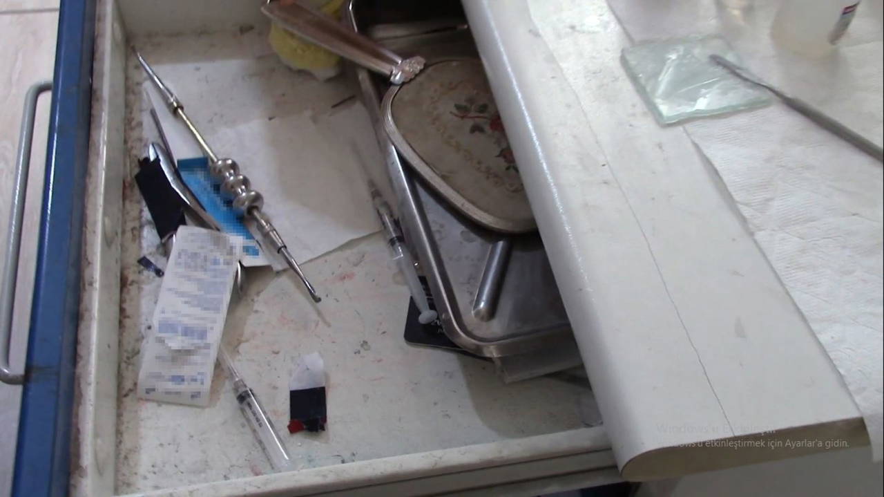 İşyerinde yapılan kontrolde diş muayenesi için gerekli malzemeler olduğu tespit edilirken, tedavi sırasında kullanılan malzemelerin tekrardan kullanılmak üzere saklandığı kaydedildi.