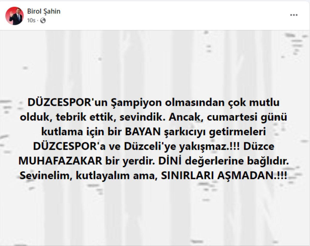 Şahin, futbolda ikinci lige yükselen Düzcespor’un düzenlediği şampiyonluk kutlamasında kadın sanatçının sahne almasına yönelik “Kutlama için bir bayan şarkıcı getirmeleri Düzcespor’a ve Düzce’ye yakışmaz” ifadelerini kullandı.