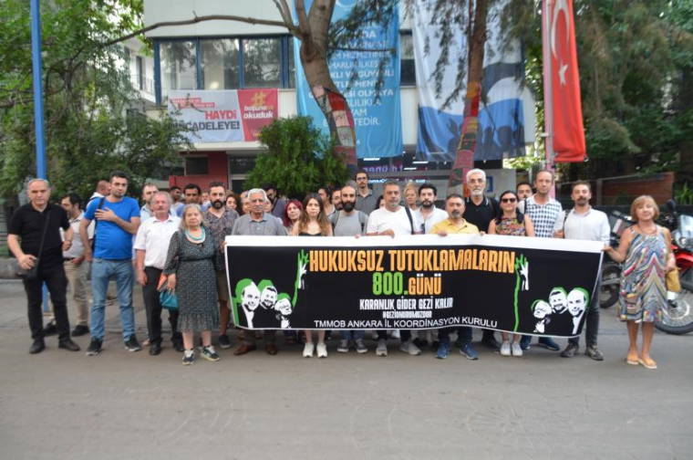TMMOB ve bağlı odaları Gezi Davası kararına karşı başlattığı 'Adalet Nöbeti'nde ve 'hukuksuz' tutuklulamaların 800. gününde Ankara Mimarlar Odası önünde bir basın açıklaması gerçekleştirdi.