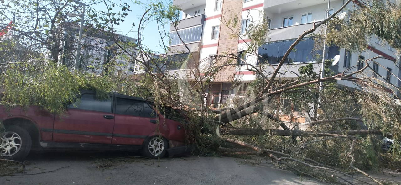 Rüzgarın etkisiyle kök kısmından kopan ağaç, park halindeki bir aracın üzerine düştü. Elektrik kesintilerinin yaşandığı kentte, bir motosiklet sürücüsü de uçan çatının altında kalıp, yaralandı.