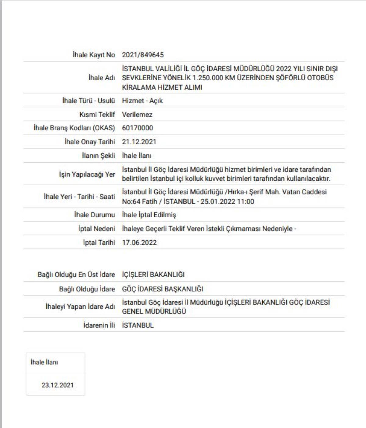 Ayrılan ödeneğin yetersizliği dışında açılan ihaleler teklif verilmediği için de iptal oluyor. Göçmen problemini en derinden hisseden İstanbul’da 2022 yılında sınırdışı etmek için açtığı ihale katılım olmayınca iptal edildi. İstanbul Valiliği İl Göç İdaresi Müdürlüğü’nün 2022 yılı sınır dışı sevklerine yönelik “1.250.000 km üzerinden şoförlü otobüs kiralama hizmet alımı” bu gerekçe ile iptal edildi. Kamu İhale Kurumu (KİK) tarandığında ise bu ihalenin yeniden açılmadığı ortaya çıktı.