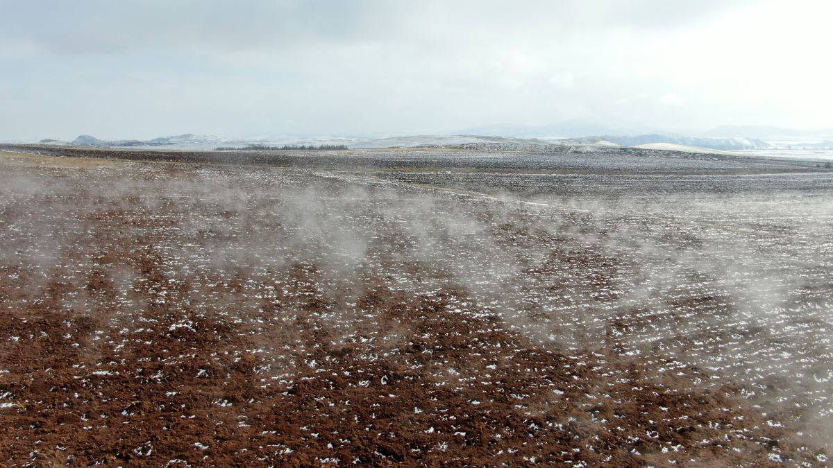 Sivas’ın Hafik ilçesi yakınlarında bulunan bir tarlada özellikle soğuk havada ve kış aylarında yükselen su buharı dikkat çekiyor. Sivas-Erzincan karayolu üzerindeki geniş tarla, çevresi kala kaplı olmasına rağmen kar tutmuyor.