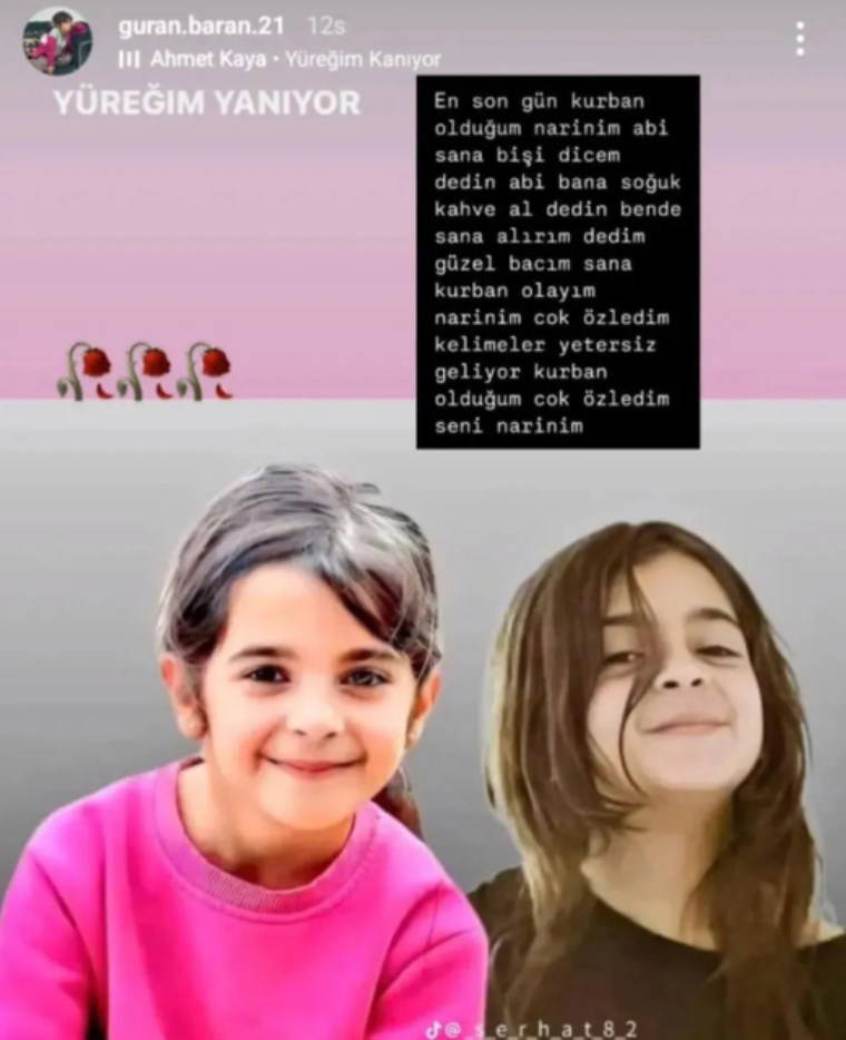 Diyarbakır’da Tavşantepe Mahallesi'nde 21 Ağustos 2024'te kaybolduktan 21 gün sonra cansız bedeni Eğertutmaz Deresi'nde çuvalın içinde bulunan 8 yaşındaki Narin Güran’ın ağabeyi Baran Güran’dan paylaşım geldi.