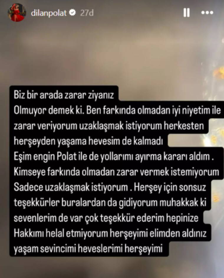 Dilan Polat sosyal medya hesabından yaptığı paylaşımda "Biz bir arada zarar ziyanız. Olmuyor demek ki. Ben farkında olmadan iyi niyetim ile zarar veriyorum uzaklaşmak istiyorum herkesten her şeyden yaşama hevesim de kalmadı. Eşim Engin Polat ile de yollarımı ayırma kararı aldım" dedi.