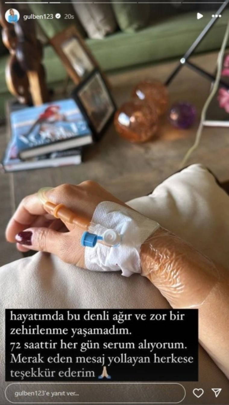 Damar yolu açılmış olan Gülben Ergen serum takılmış kolunun fotoğrafını paylaşarak zehirlendiğini duyurdu.