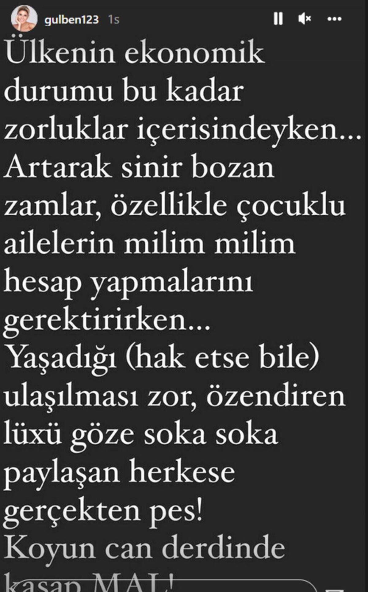 "Ülkenin ekonomik durumu bu kadar zorluklar içerisindeyken...Artarak sinir bozan zamlar, özellikle çocuklu ailelerin milim milim hesap yapmalarını gerektirirken... Yaşadığı (hak etse bile) ulaşılması zor, özendiren lüksü göze soka soka paylaşan herkese gerçekten pes! Koyun can derdinde kasap mal."