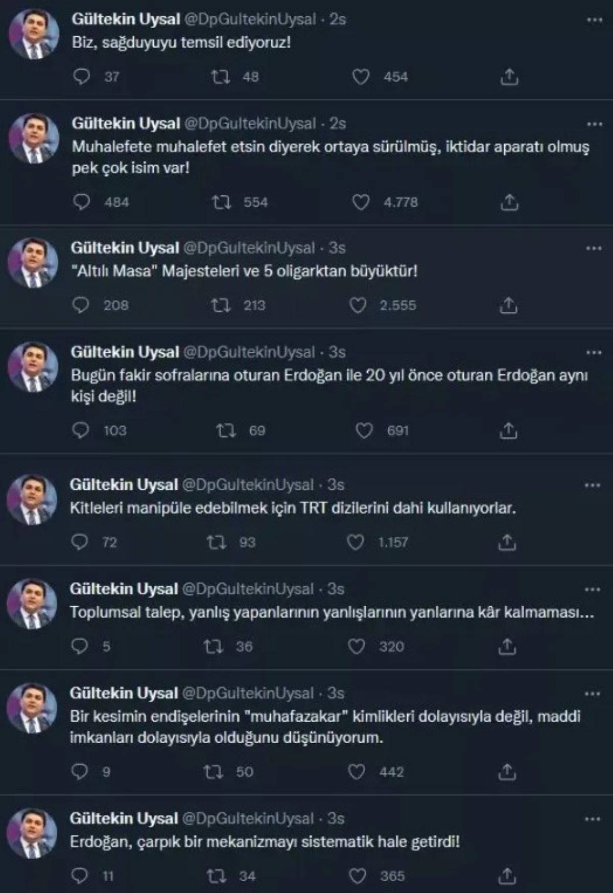 Altılı ittifakın üyelerinden Demokrat Parti Genel Başkanı Gültekin Uysal, gece saatlerinde Twitter hesabından peş peşe paylaşımlarda bulundu. “Muhalefete muhalefet etsin diyerek ortaya sürülmüş, iktidar aparatı olmuş pek çok isim var!” diyen Uysal,“Rahmetli Cumhurbaşkanımız Demirel ‘Çarık ayağı sıkıyor mu?' diye sorardı. Çarık, artık vatandaşın ayağını yara etti; bırakın sıkmayı!” ifadelerini kullandı.