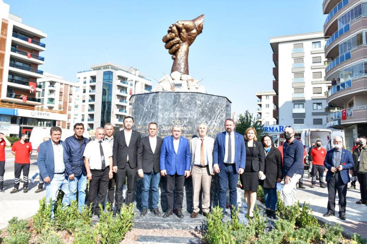 Çiğli Belediyesi Heykel Atölyesinde yaptırılan Çiğli Deprem Anıtı'nın açılış töreni, büyük depremin birinci yıl dönümü olan 30 Ekim Cumartesi günü (bugün) Ataşehir Mahallesi Ekol Hastanesi kavşağında gerçekleştirildi. Törene İzmir Milletvekili Bedri Serter, Çiğli Kaymakamı Adnan Çakıroğlu, CHP Çiğli İlçe Başkanı Mert Özcan, anıtı tasarlayan heykeltıraşlar Ferit Furuncu ve Martıgül Kalkan ile meclis üyeleri, muhtarlar, sivil toplum kuruluşu temsilcileri ve çok sayıda vatandaş katılım gösterdi.