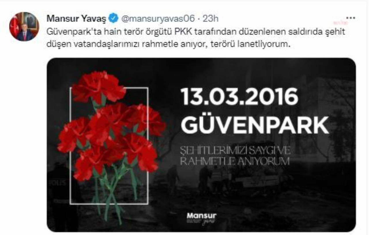 Mansur Yavaş, sosyal medya hesabında da “Güvenpark'ta hain terör örgütü PKK tarafından düzenlenen saldırıda şehit düşen vatandaşlarımızı rahmetle anıyor, terörü lanetliyorum” paylaşımı yaptı.