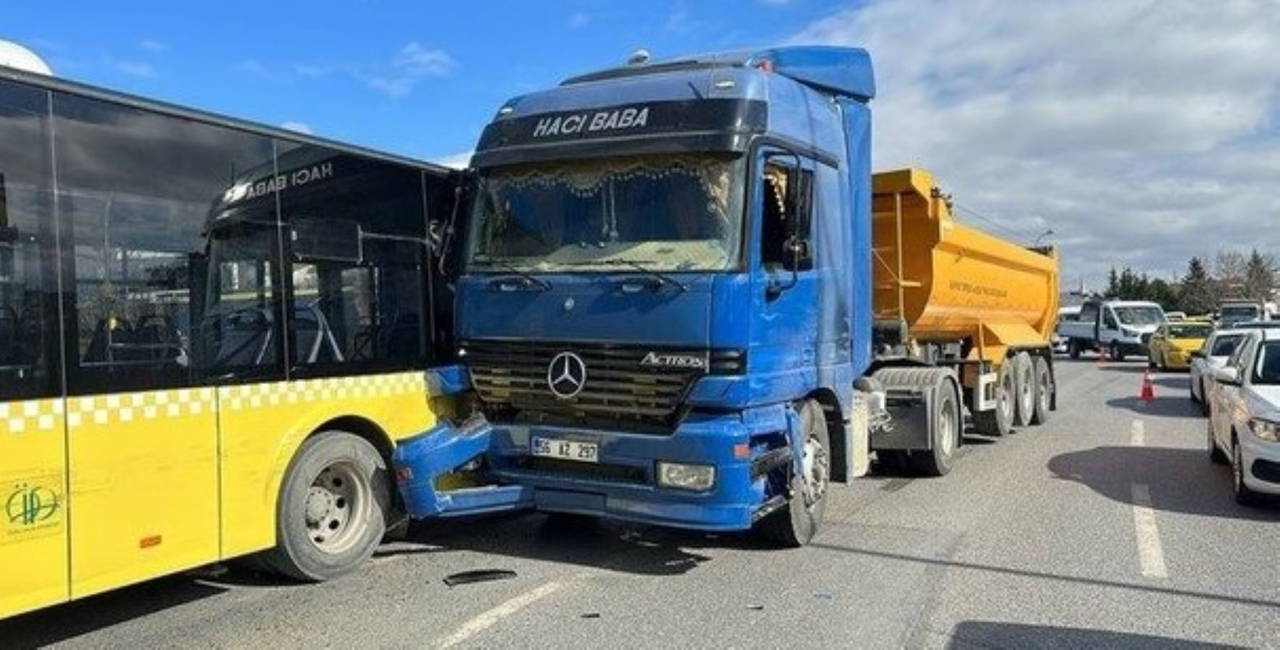 İstanbul'da Şile Otoyolu'nda duraktan çıkan İETT otobüsüne aynı istikametteki hafriyat kamyonu yandan çarptı.