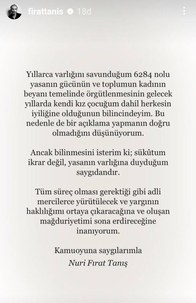 Tanış, sosyal medya hesabı üzerinden yaptığı açıklamada, 6284 Sayılı Yasa'ya atıfta bulunarak "Sükutum ikrar değil, yasanın varlığına duyduğum saygıdan" dedi.