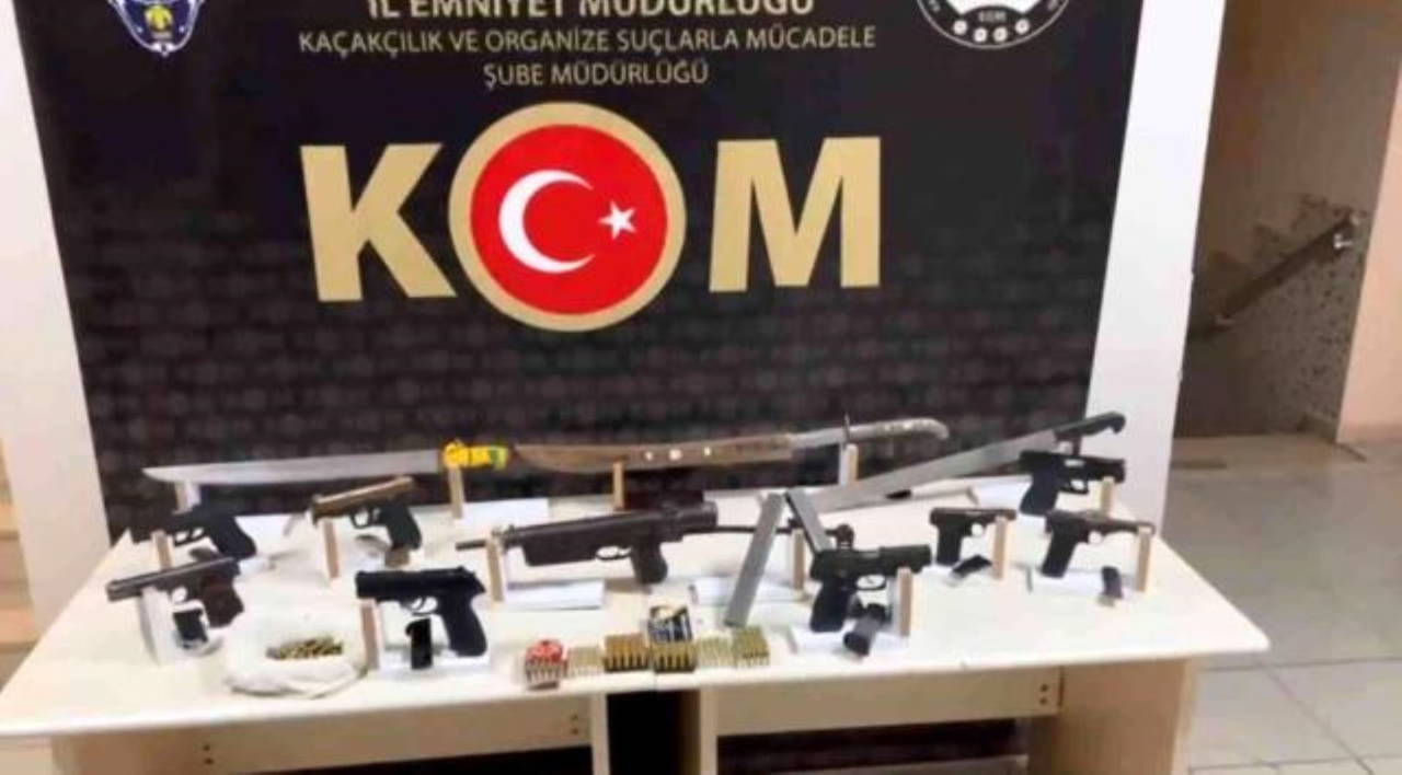 Yapılan aramada, çok sayıda uzun namlulu silah, tam otomatik tabanca, 11 ruhsatsız tabanca, av tüfeği, 566 fişek, 13 şarjör, 2 kesici alet ve kılıç ele geçirildi.