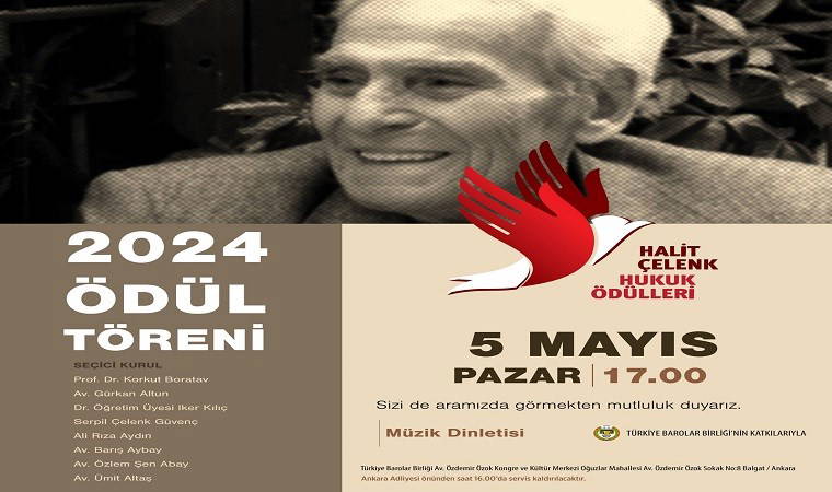 Türkiye Barolar Birliği’nin (TBB) katkılarıyla düzenlenen 2024 Halit Çelenk Hukuk Ödülleri, 5 Mayıs Pazar Günü saat 17.00’de sahiplerini buluyor. Ankara’da Türkiye Barolar Birliği Av. Özdemir Özok Kongre ve Kültür Merkezi’nde düzenlenecek olan törende, müzik dinletisi ile birlikte hukuk ödülüne layık görülen isimler açıklanacak. Ödüllerin seçici kurulunda; Prof. Dr. Korkut Boratav, Av. Gürkan Altun, Dr. Öğretim Üyesi Iker Kılıç, Serpil Çelenk Güvenç, Ali Rıza Aydın, Av. Barış Aybay, Av. Özlem Şen Abay ve Av. Ümit Altaş yer alıyor.