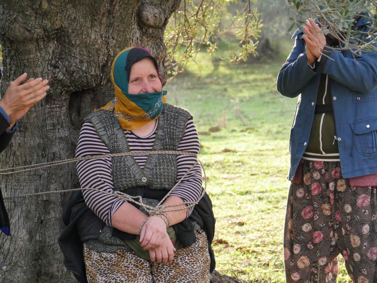 Kendilerinden sorumlu kahyayı, hasattan sonra zeytin ağacına bağlayan işçiler, "helalleşmek" amacıyla tarla sahibini çağırıyor.