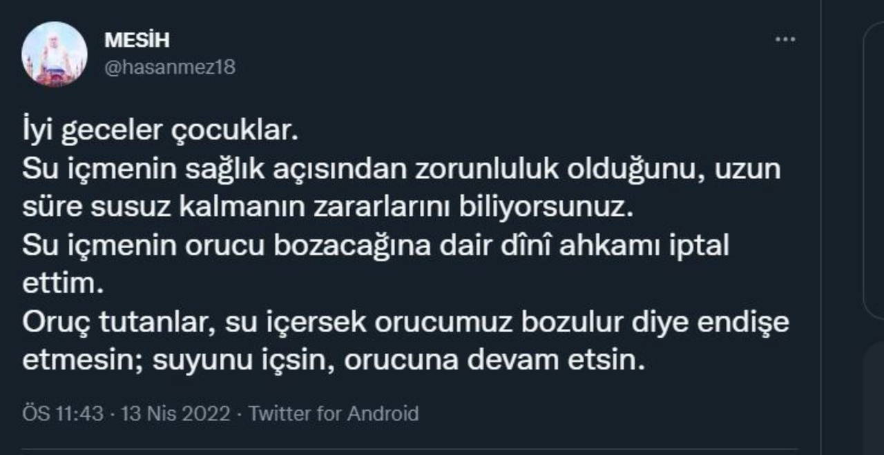 “Su içmenin orucu bozacağına dair dînî ahkamı iptal ettim” diyen Mezarcı, Twitter paylaşımda şu ifadeleri kullandı;