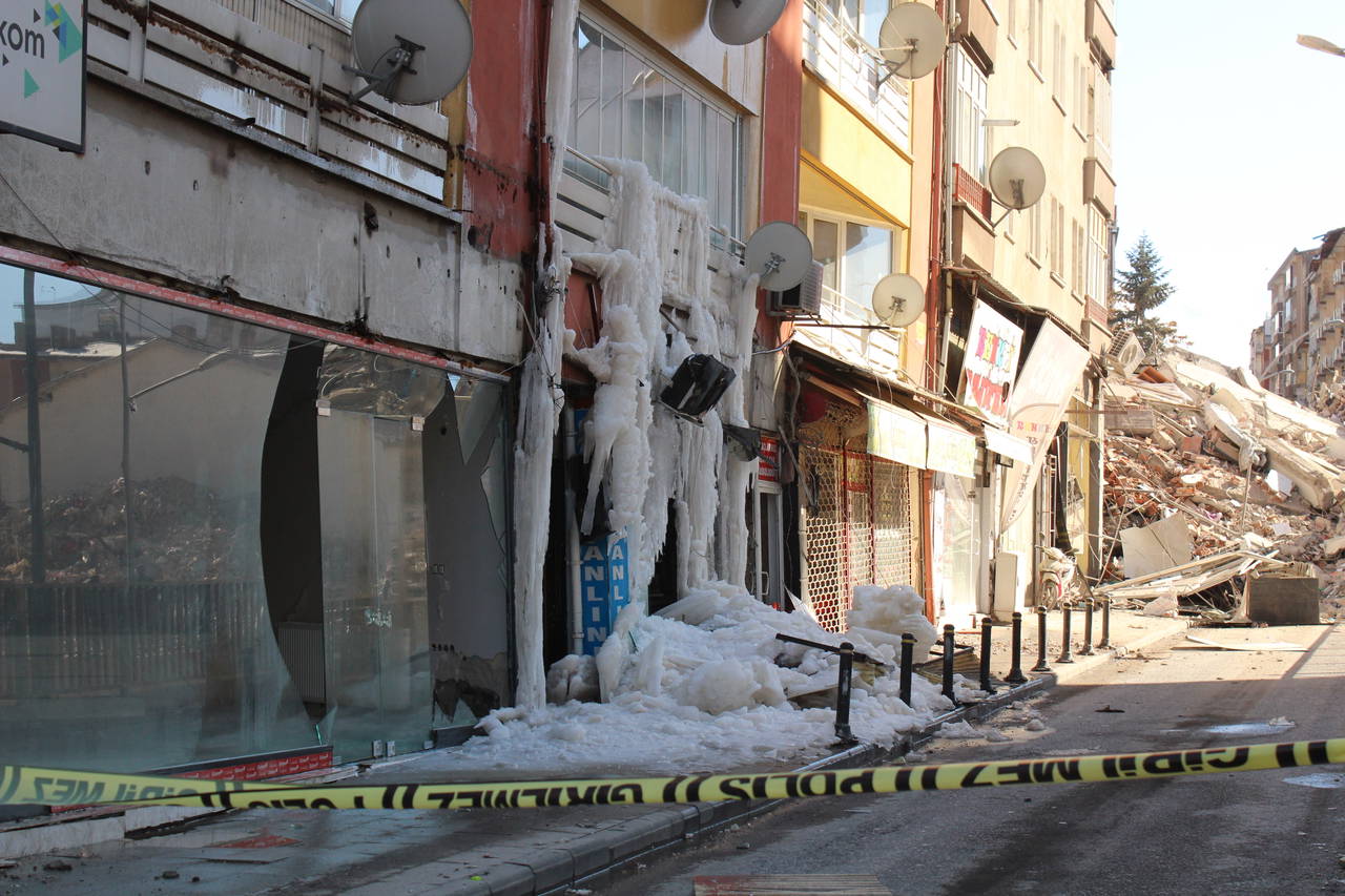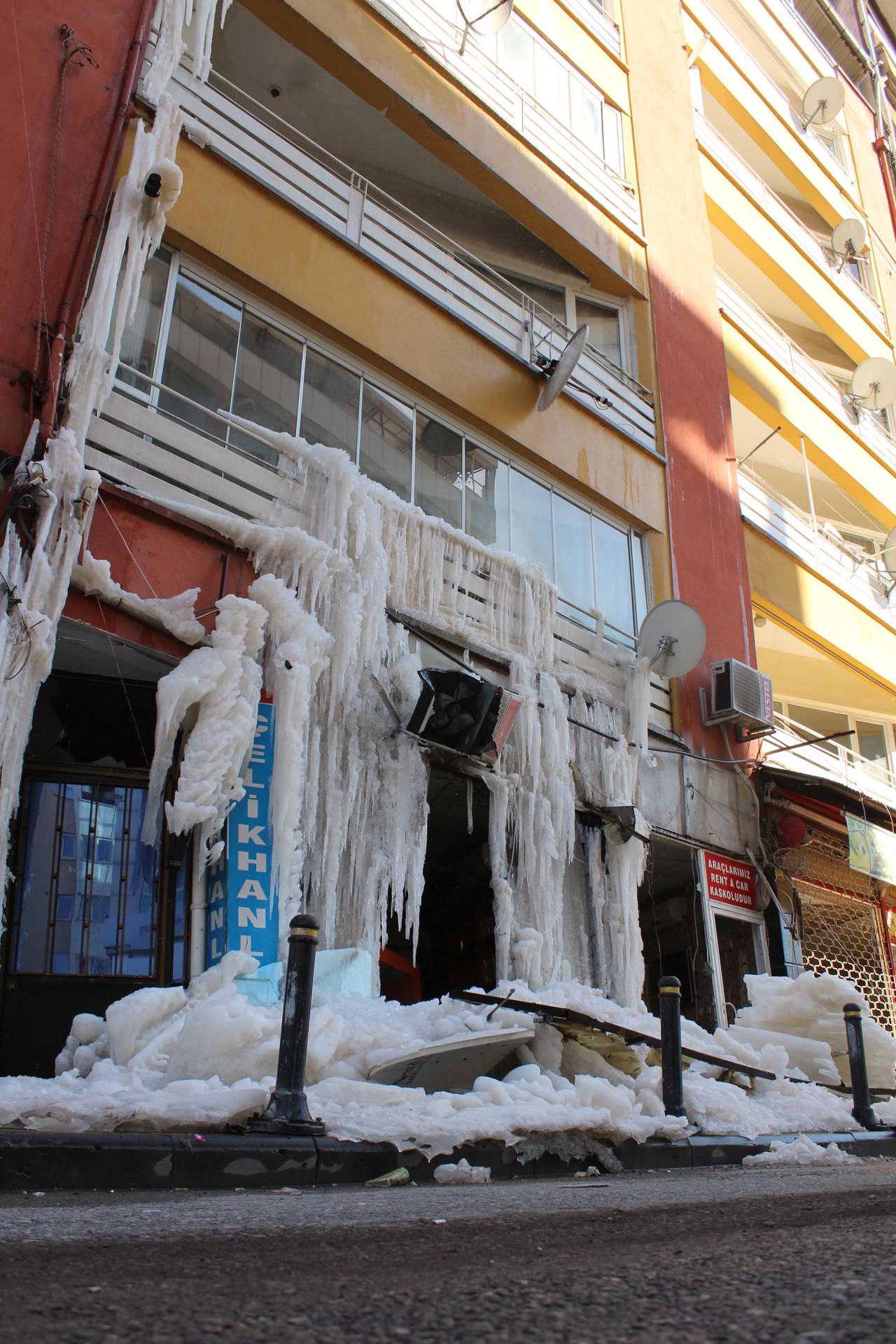Sular, 4'üncü kattan aşağı akarken, havanın da soğumasıyla binanın 1'inci katı ve alt kattaki işyeri üzerinde buz sarkıtları oluştu.