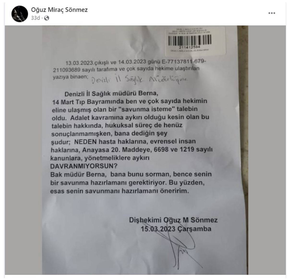 Gelişmelere tepki gösteren Denizlili diş hekimi Oğuz Miraç Sönmez, İl Sağlık Müdürlüğü’nün kanunları ve anayasayı çiğnediğini belirtti. Sönmez, sosyal medya hesabından paylaştığı resmi savunma dilekçesinde, “Adalet kavramına aykırı olduğu kesin olan bu talebin hakkında hukuksal süreç henüz sonuçlanmamışken bana dediğin şey şudur: Neden hasta haklarına, insan haklarına, anayasanın 20. maddesine, 6698 ve 1219 sayılı kanunlara yönetmeliklere aykırı davranmıyorsun. Bak müdür Berna, bana bunu sorman, bence senin bir savunma hazırlamanı gerektiriyor. Bu yüzden esas senin savunma hazırlamanı öneririm” ifadelerine yer verdi.