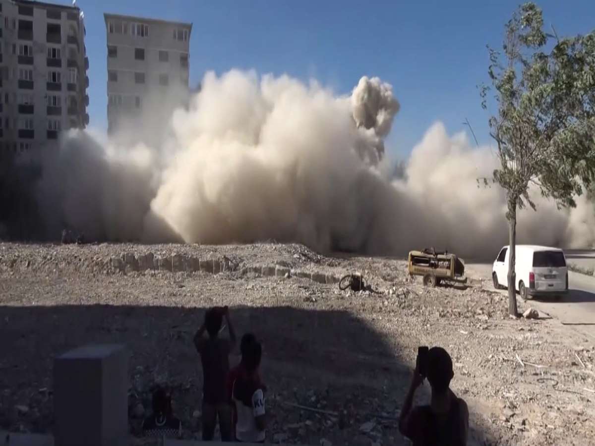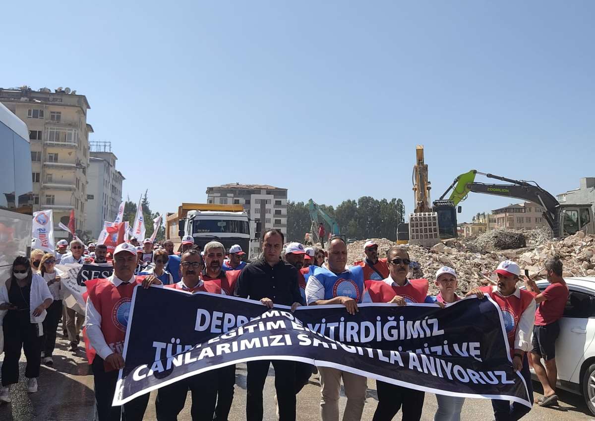 Yaşanan sorunlara dikkat çekmek ve deprem bölgesi eğitim raporunu açıklamak için Eğitim-İş bölgede. Yıkılan Eğitim İş Şubesi’nden Ulus Meydanı’na doğru sessiz yürüyüş yapılıyor. Çok uzun olmayan mesafe olmasına rağmen o yolda da yıkımlar sürdüğü için kortej adeta toz bulutunun içinden geçiyor. Yıkılmış bir şehirde yıkımların arasından.