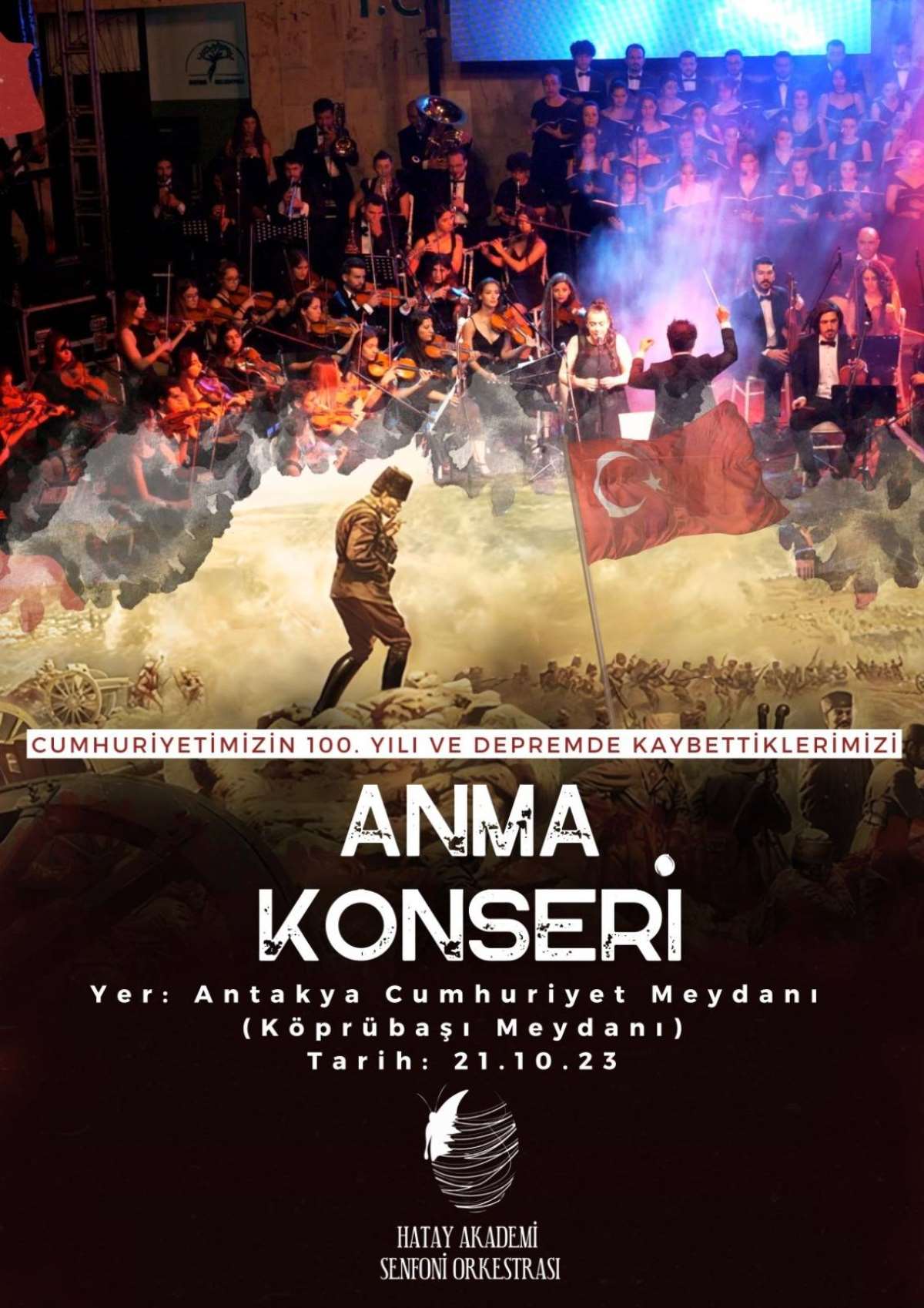 Hatay Akademi Senfoni Orkestrası depremin etkileriyle mücadele eden toplumumuza destek olmak amacıyla “Cumhuriyet’in 100. Yılı ve Deprem Anma Konseri”ni Hatay’ın kalbi olan Antakya Cumhuriyet Meydanı’nda (Köprübaşı) açık havada düzenleyerek gelecek için umut dolu bir toplum hafızasının inşasına müzik ile katkı sunmayı amaçlıyor. Bu özel etkinlik, toplumun birlik ve beraberlik ruhunu pekiştirmek, moral vermek ve geleceğe umutla bakmalarını sağlamak amacıyla tasarlandı. Konser kadrosunu; Hatay Akademi Senfoni Orkestrası’nın depremden dolayı Türkiye’nin farklı şehirlerine göç etmek zorunda kalan müzisyenlerinin yanı sıra ülkemizdeki opera, senfoni ve konservatuar müzisyenleri ve Hatay ’da bulunan müzik öğretmenleri oluşturuyor. Sahnede, Cumhuriyet’in 100. yılını temsilen 100 kişilik orkestra ve 100 kişilik koro yer alacak. Böylelikle toplumun genelinde depremde kaybettiklerimizi anmayı ve umudu yeşertmeyi hedefleyen bu konser, deprem bölgesinde yeni yaşamı örmenin adımlarını atmayı amaçlıyor.