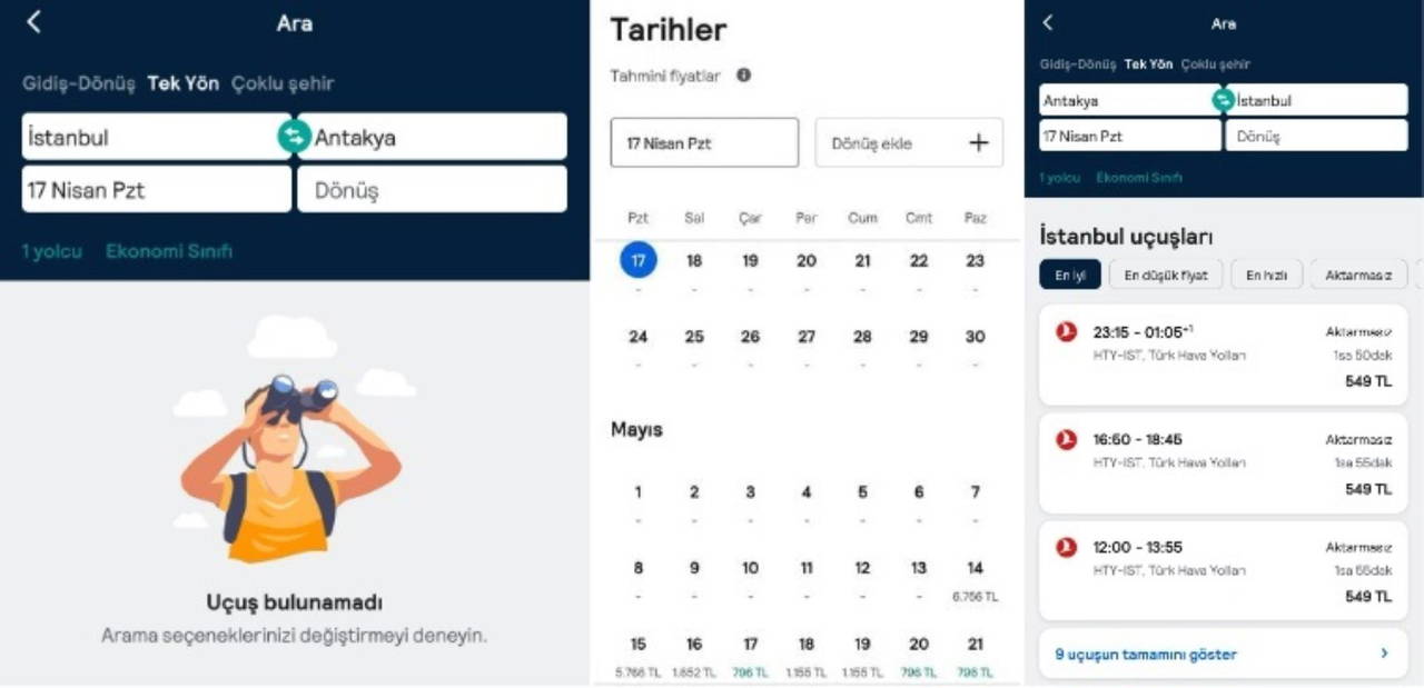İstanbul’dan Hatay’a 14 Mayıs’tan itibaren bilet bulunabiliyor. Hatay'dan İstanbul yönüne olan uçuşlarda ise herhangi bir sorun bulunmuyor.