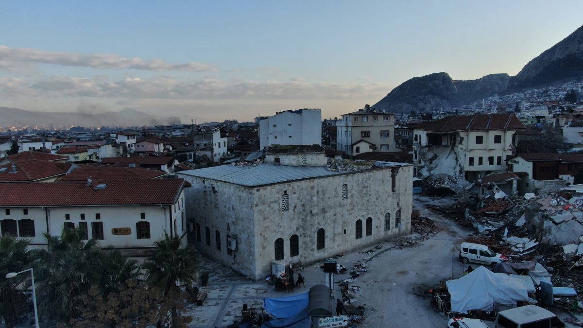 Tarihi 7’nci yüzyıla dayanan ve avlusunda da 19’uncu yüzyılda inşa edilen bir şadırvan bulunan cami, dron ile havadan görüntülendi. 14 asırlık caminin yakınında bulunan tarihi Yeni Hamam da depremde hasar gördü.