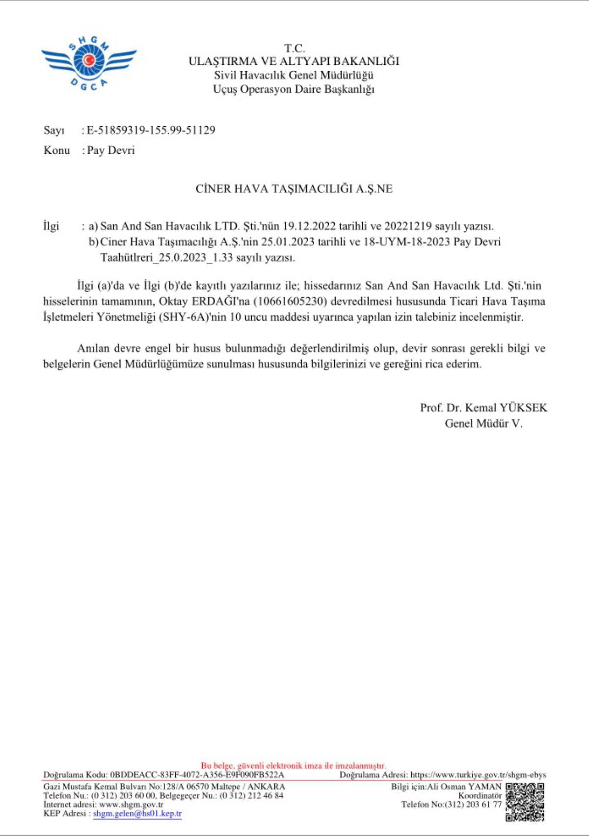 Atila Sertel, havacılık sektöründe şaşkınlık yaratan şirket devrine ilişkin belgeyi kamuoyuyla paylaşarak, Ulaştırma Bakanlığı’nda düz memur olarak göreve başlayan ve Sivil Havacılık Genel Müdür Yardımcılığına kadar yükselen Oktay Erdağı’nın Turgay Ciner’in sahibi olduğu Ciner Havacılık’ı milyonlarca dolara satın almasının sektörde şaşkınlık yarattığını ve dikkatleri üzerine çektiğini dile getirdi.