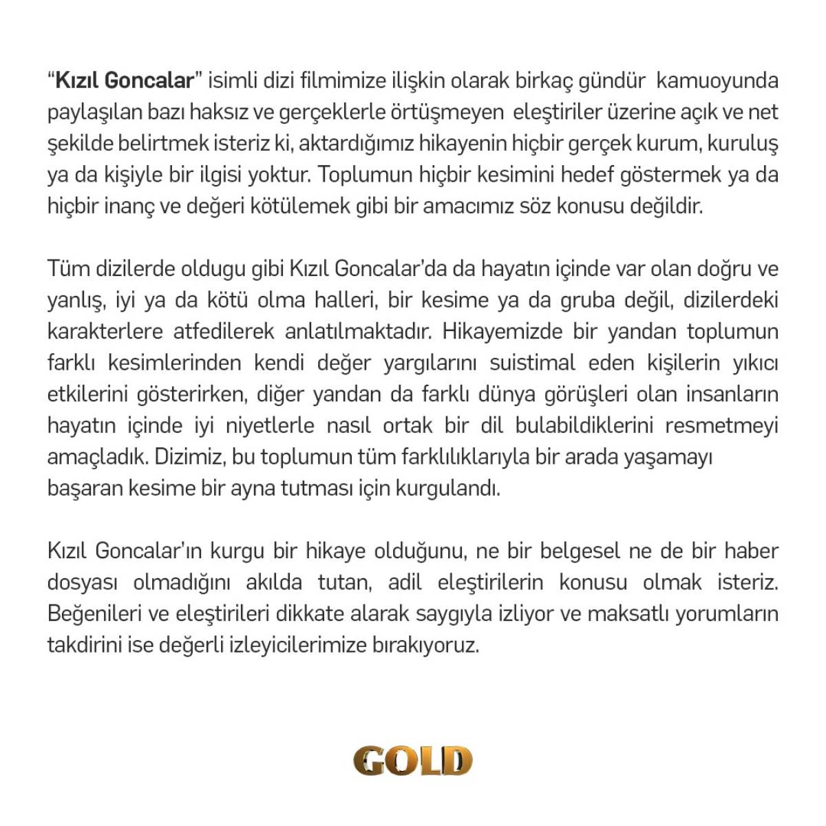 Son olarak Türkiye'nin gündemindeki diziye ilişkin, Gold Film'den açıklama geldi.