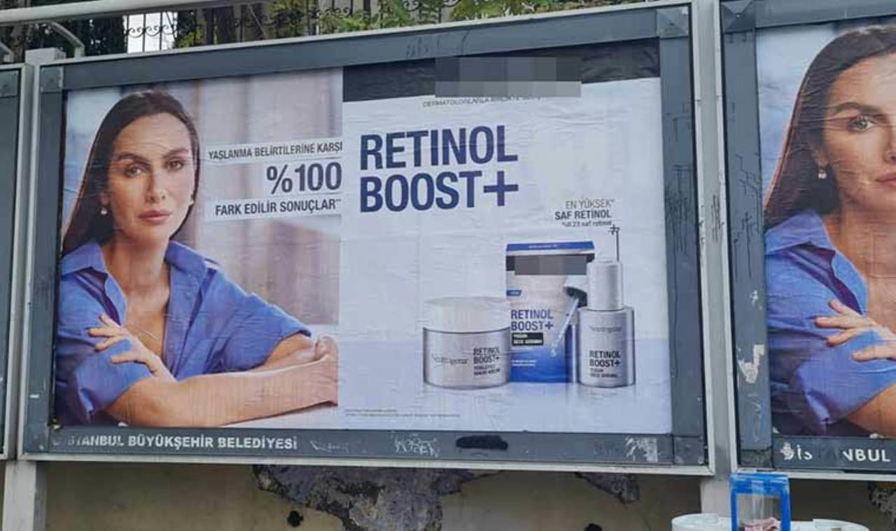 Kızıl Goncalar'ın afişinin yerine, oyuncu Birce Akalay'ın yüzü olduğu bir cilt bakım markasının reklamı asıldı.