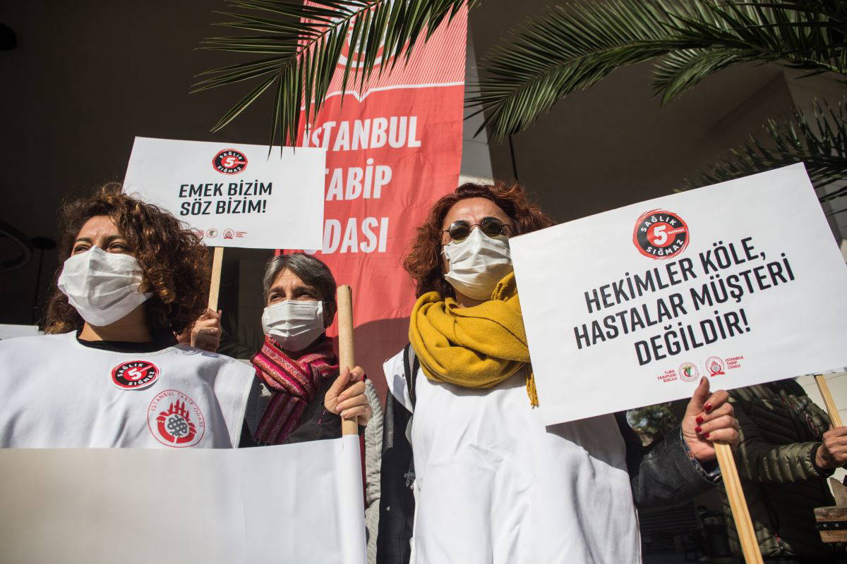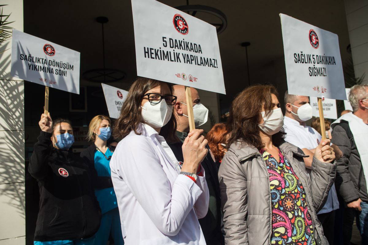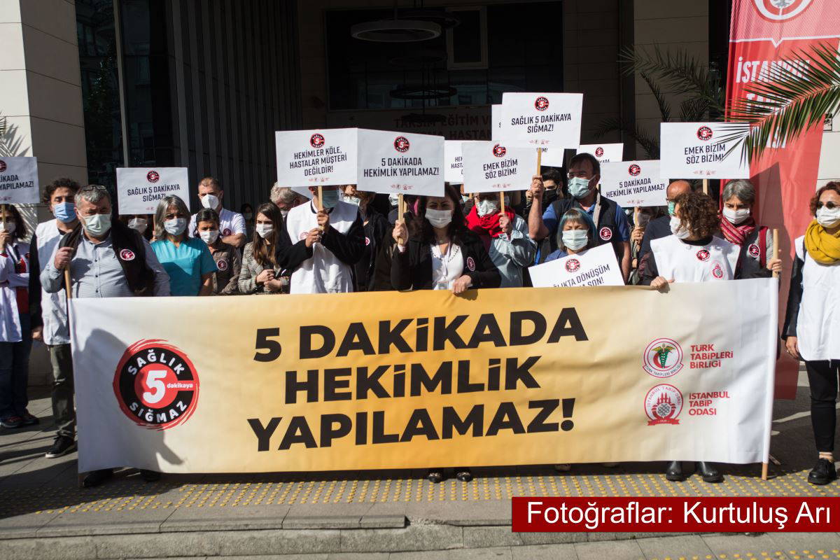 İstanbul Tabip Odası tarafından yapılan eylemde, "Sağlık 5 dakikaya sığmaz. 5 dakikada hekimlik yapılamaz" pankartı açıldı. "Sağlıkta dönüşüm yıkımına son", "Hekimler köle hastalar müşteri değildir", "Emek bizim söz bizim" dövizlerinin taşındığı eylemde, sık sık, "Sağlık hakkı satılamaz", "Kurtuluş yok tek başına ya hep beraber ya hiçbirimiz" sloganları atıldı. Çevreden geçen yurttaşlar ile hastaneye gelen hastalarında alkışlarla destek verdiği eylemde basın açıklamasını İstanbul Tabip Odası yönetim kurulu üyesi Dr. Güray Kılıç okudu.