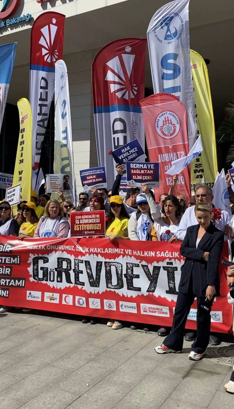 Taksim Eğitim ve Araştırma Hastanesi önüne taşınan eylemde, İstanbul Tabip Odası, Sağlık ve Sosyal Hizmet Emekçileri Sendikası (SES), Birleşik Dayanışma Sendikası (BDS), İstanbul Aile Hekimleri Derneği, Hekim Birliği ve diğer sağlık örgütlerinin temsilcileri taleplerini dile getirdi.