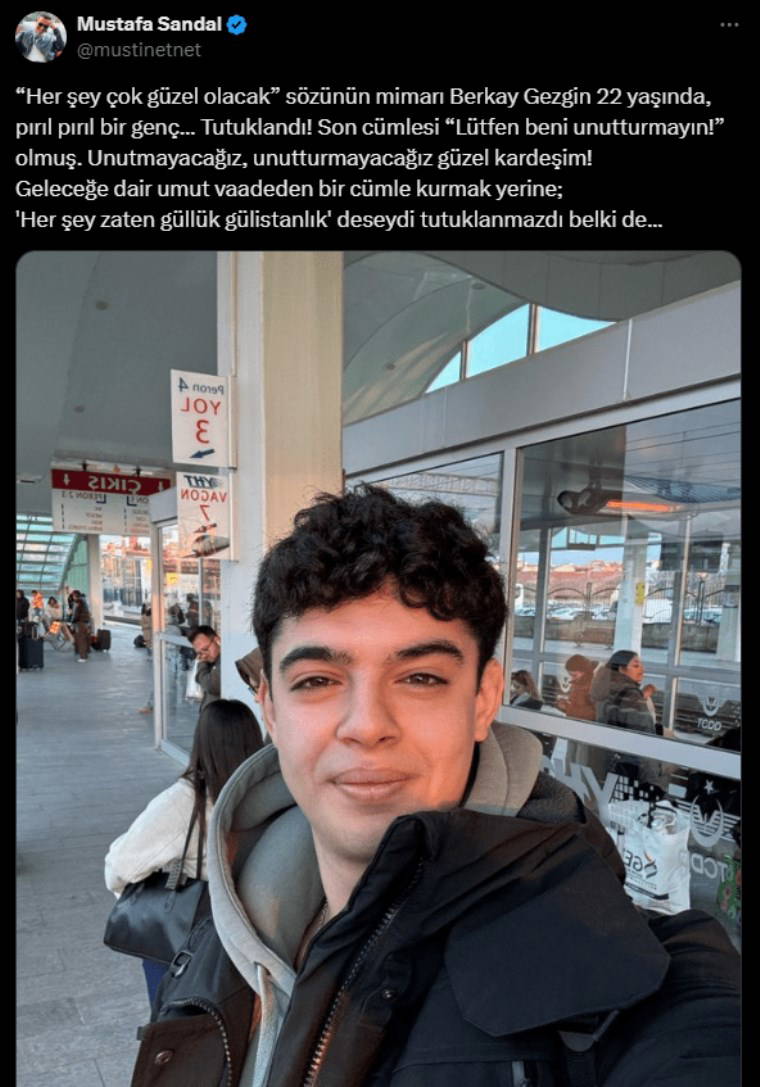 “Her şey çok güzel olacak” sözünün mimarı Berkay Gezgin 22 yaşında, pırıl pırıl bir genç... Tutuklandı! Son cümlesi “Lütfen beni unutturmayın!” olmuş. Unutmayacağız, unutturmayacağız güzel kardeşim!
