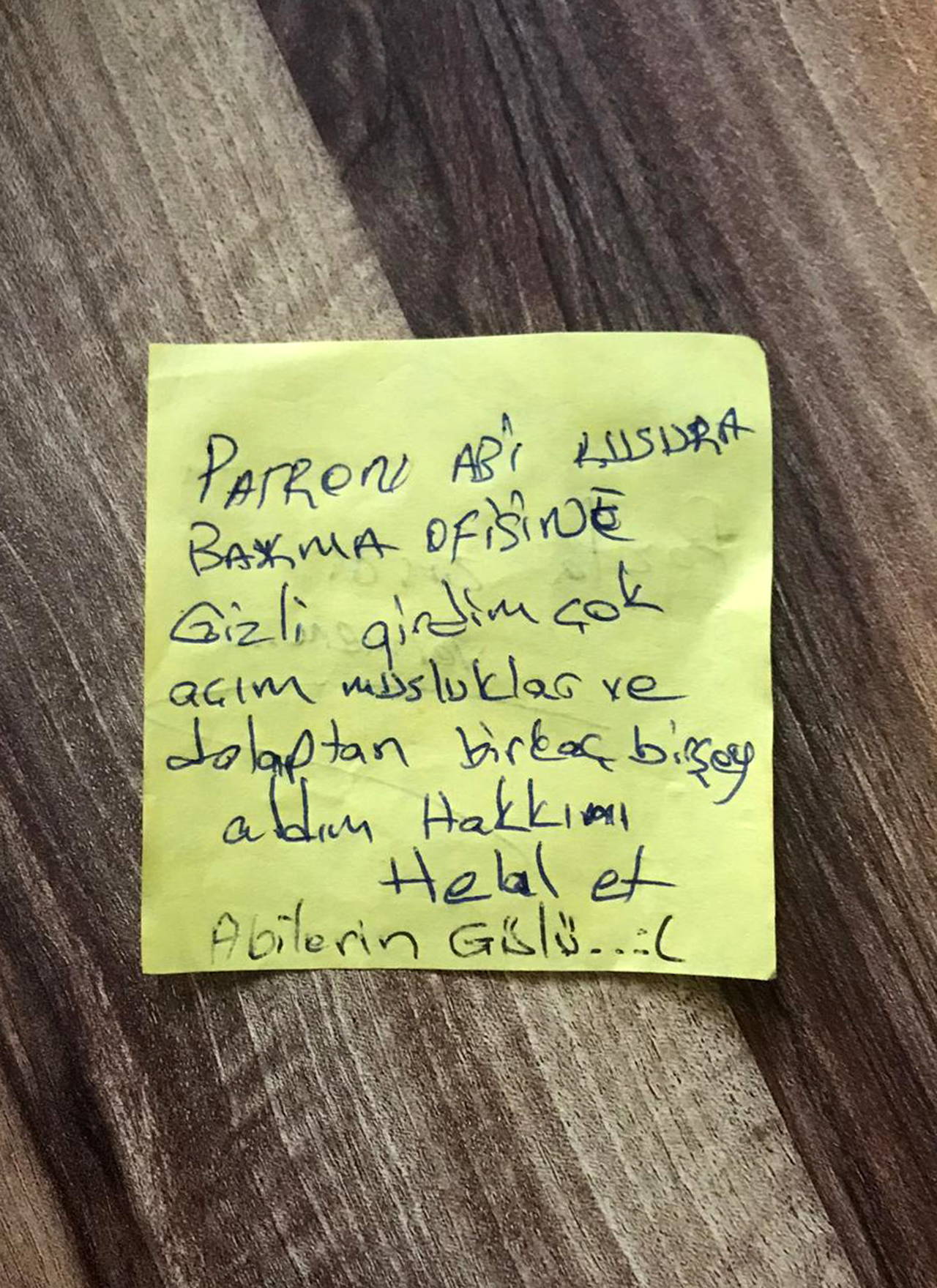 Şüpheli iş yerinden çıkmadan önce, 'Patron abi kusura bakma. Ofisine gizli girdim, çok açım. Muslukları ve dolaptan birkaç eşya aldım. Hakkını helal et abilerin gülü' yazılı not bıraktı.