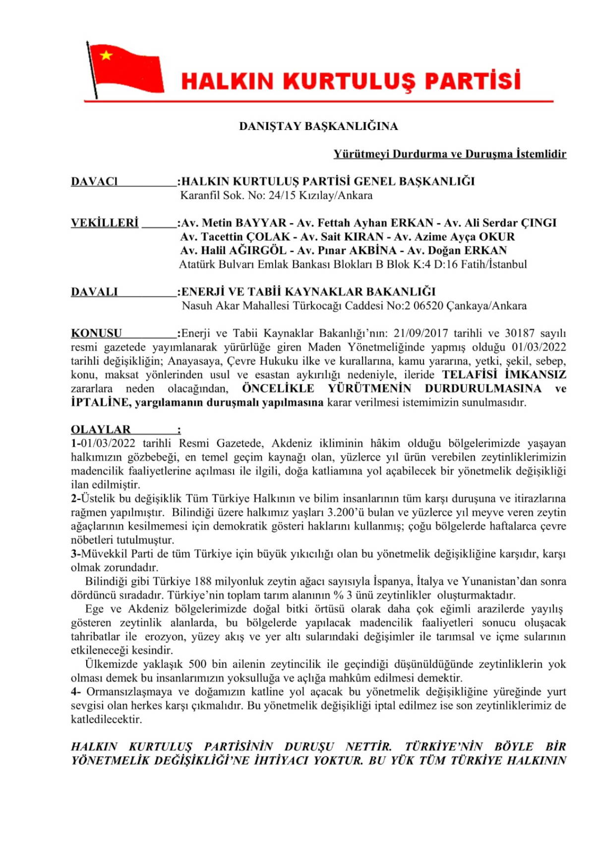 Halkın Kurtuluş Partisi (HKP) MYK Üyesi Avukat Pınar Akbina, zeytinliklerin madenciliğe açılmasına olanak sağlayan yönetmeliğe tepki göstererek, Yönetmeliğin yürütmesinin durdurulması ve iptali için Danıştay’a başvurduklarını açıkladı.