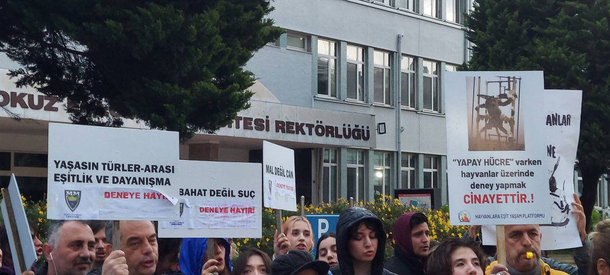 Rektör Fatma Seniha Nükhet Hotar’ın Dokuz Eylül Üniversitesi’nin (DEÜ) Balçova yerleşkesinde mayıs ayında tamamlanacağını açıkladığı "Büyük Deney Hayvanları Araştırma Laboratuvarı" projesi 4 Ekim Hayvanları Koruma Günü rektörlük önünde protesto edildi.