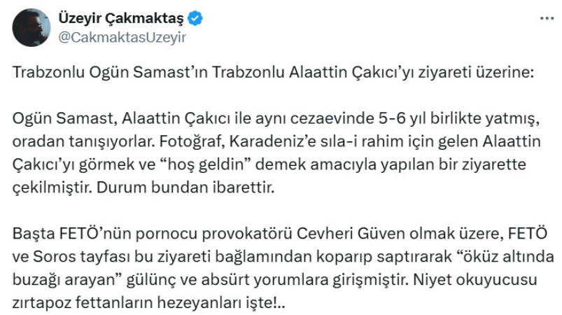 "Ogün Samast, Alaattin Çakıcı ile aynı cezaevinde 5-6 yıl birlikte yatmış, oradan tanışıyorlar. Fotoğraf, Karadeniz’e sıla-i rahim için gelen Alaattin Çakıcı’yı görmek ve “hoş geldin” demek amacıyla yapılan bir ziyarette çekilmiştir. Durum bundan ibarettir.