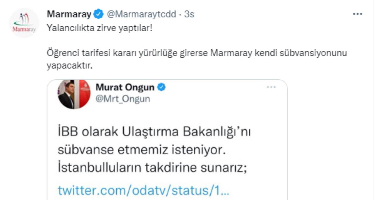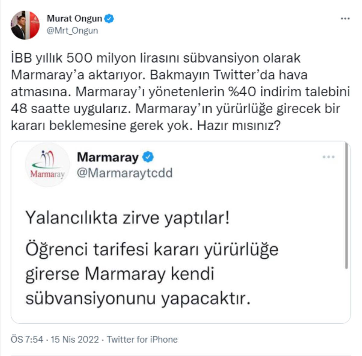 İstanbul Büyükşehir Belediyesi (İBB) Sözcüsü Murat Ongun, Ulaştırma Bakanlığı’na bağlı Marmaray’ın resmi hesabından kendisine yönelik yapılan, "Yalancılıkta zirve yaptılar! Öğrenci tarifesi kararı yürürlüğe girerse Marmaray kendi sübvansiyonunu yapacaktır" paylaşımına tepki gösterdi. Ongun, "Marmaray’ın yürürlüğe girecek bir kararı beklemesine gerek yok. Hazır mısınız?" ifadelerine yer verdi.