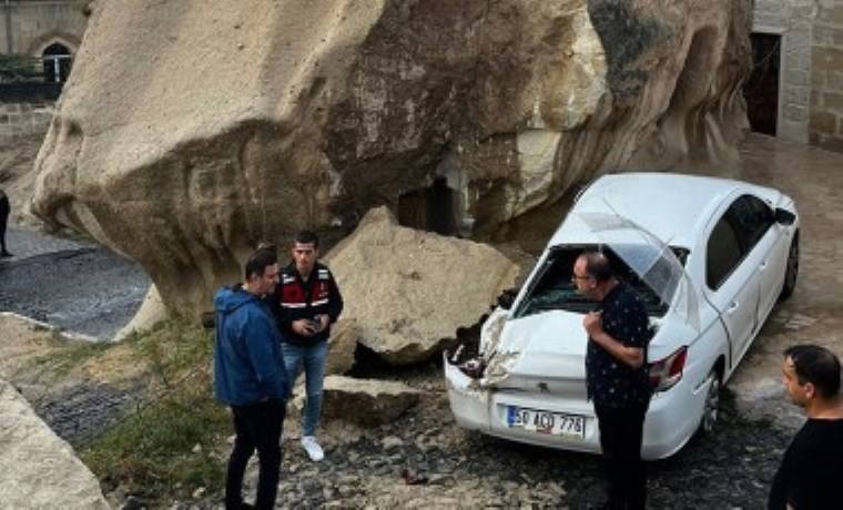 Nevşehir'de de etkili olan sağanak sele neden oldu, peribacalarından düşen kaya parçaları otomobillere zarar verdi.