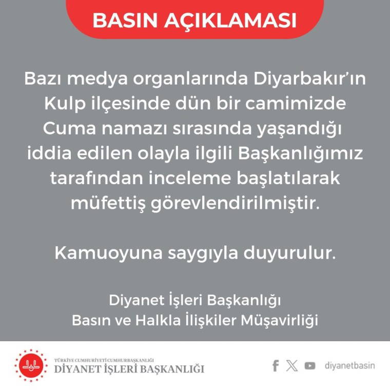 İçişleri Bakanı Ali Yerlikaya, Diyarbakır'da bir camide yaşanan olaya ilişkin inceleme başlatıldığını bildirdi.