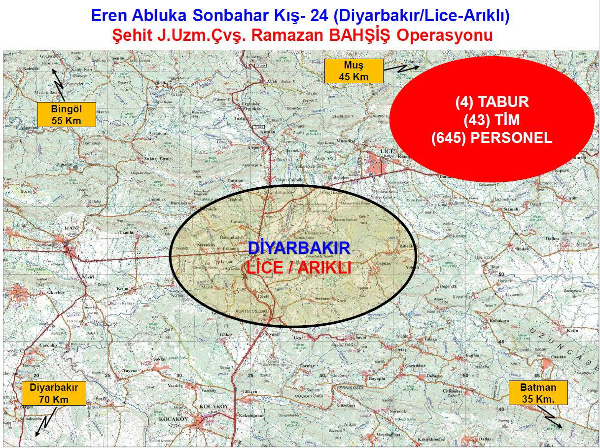 İçişleri Bakanlığı'ndan yapılan açıklamaya göre; bölgede barındığı değerlendirilen teröristleri etkisiz hale getirmek için Diyarbakır'da büyük çaplı 'Eren Abluka Sonbahar-Kış-24 (Diyarbakır/Lice- Arıklı) Şehit Jandarma Uzman Çavuş Ramazan Bahşiş Operasyonu' başlatıldı.