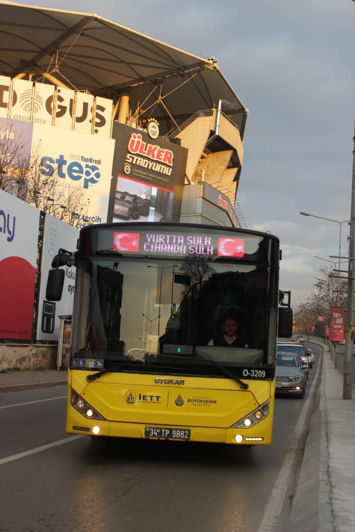 Bugün İBB'ye bağlı İETT otobüsleri ''Yurtta sulh cihanda sulh'' yazısı