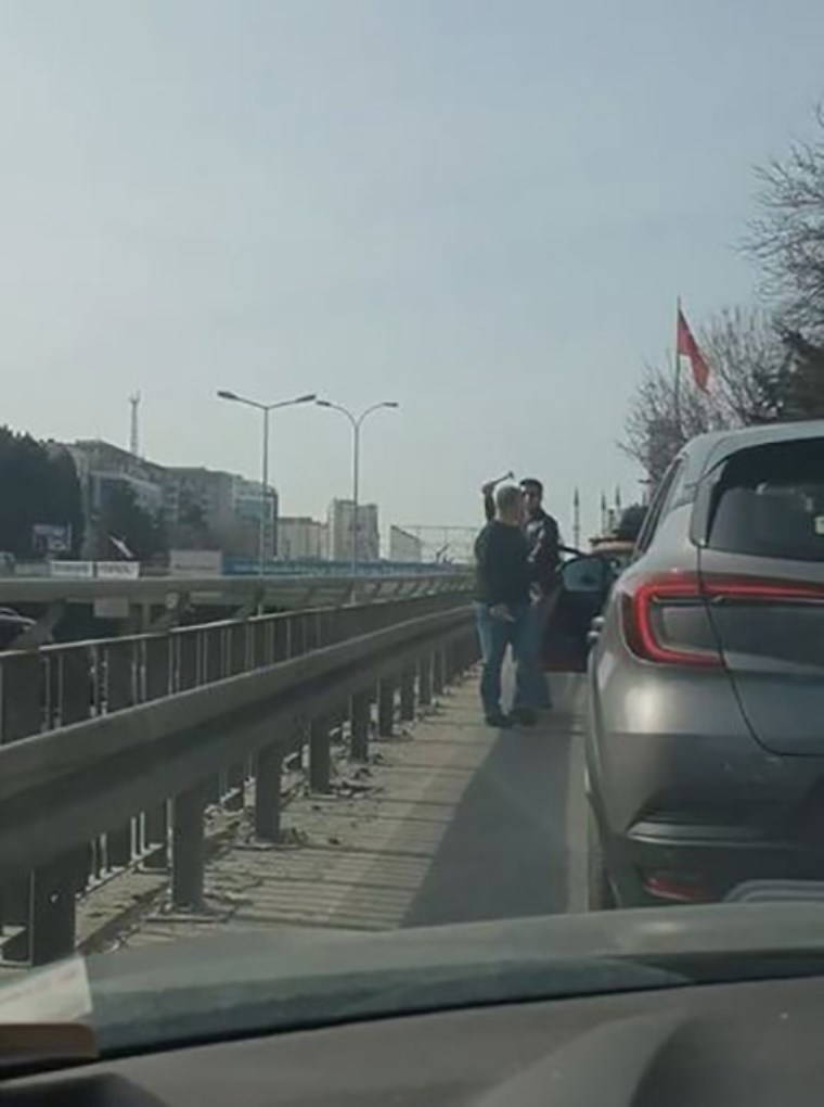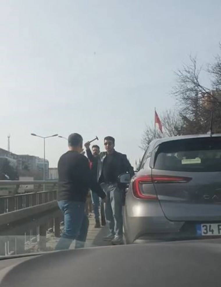 Arabasından bıçakla inen şahsa diğer sürücü çekiç ile karşılık verdi. Çekiçle aracından inen sürücü, diğer şahsı tekmeledi. Kavga, diğer sürücülerin araya girmesiyle büyümeden sonlandı.