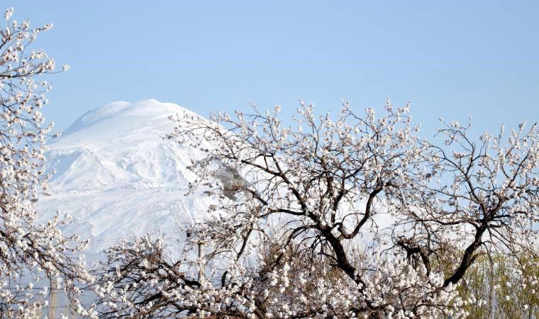 Deniz seviyesinden 5 bin 176 metre yüksekliği ile 'Türkiye'nin çatısı' olarak nitelendirilen ve yılın 12 ayı zirvesi buzullarla kaplı olan Ağrı Dağı'nın eteklerindeki Iğdır Ovası, açan kayısı çiçekleri ile beyaza büründü.